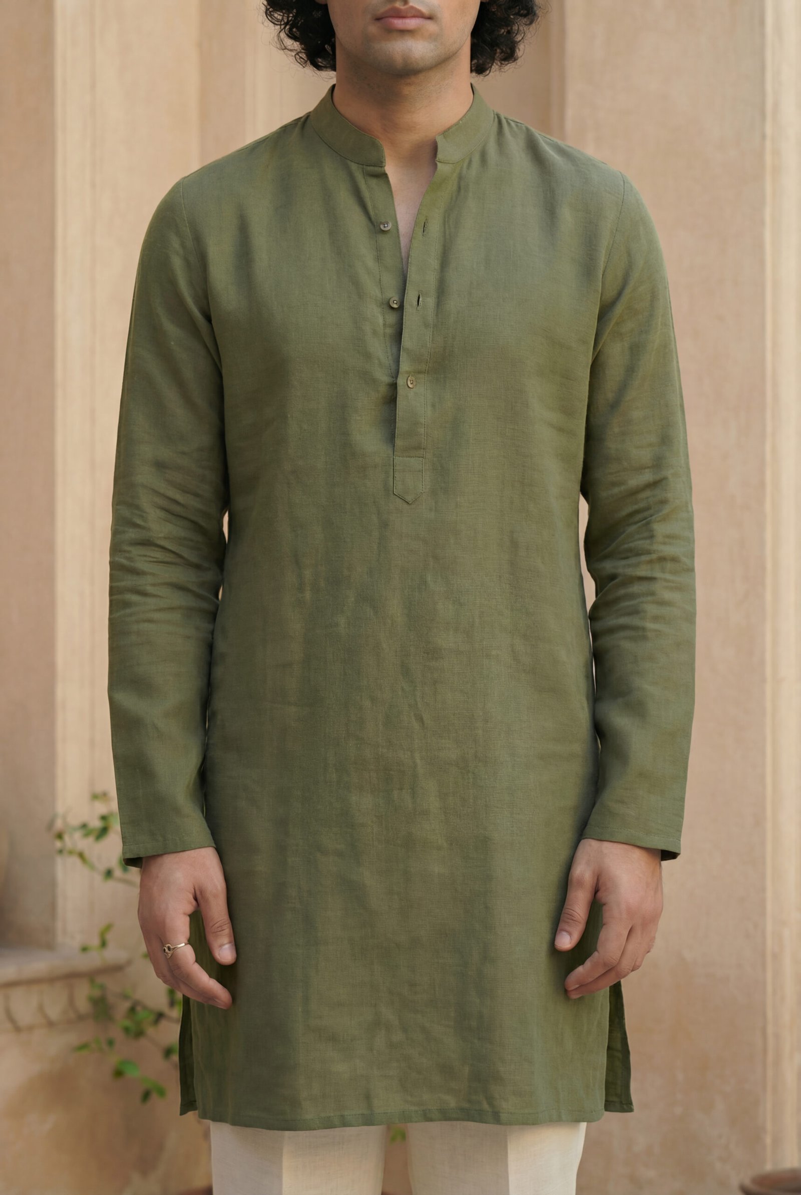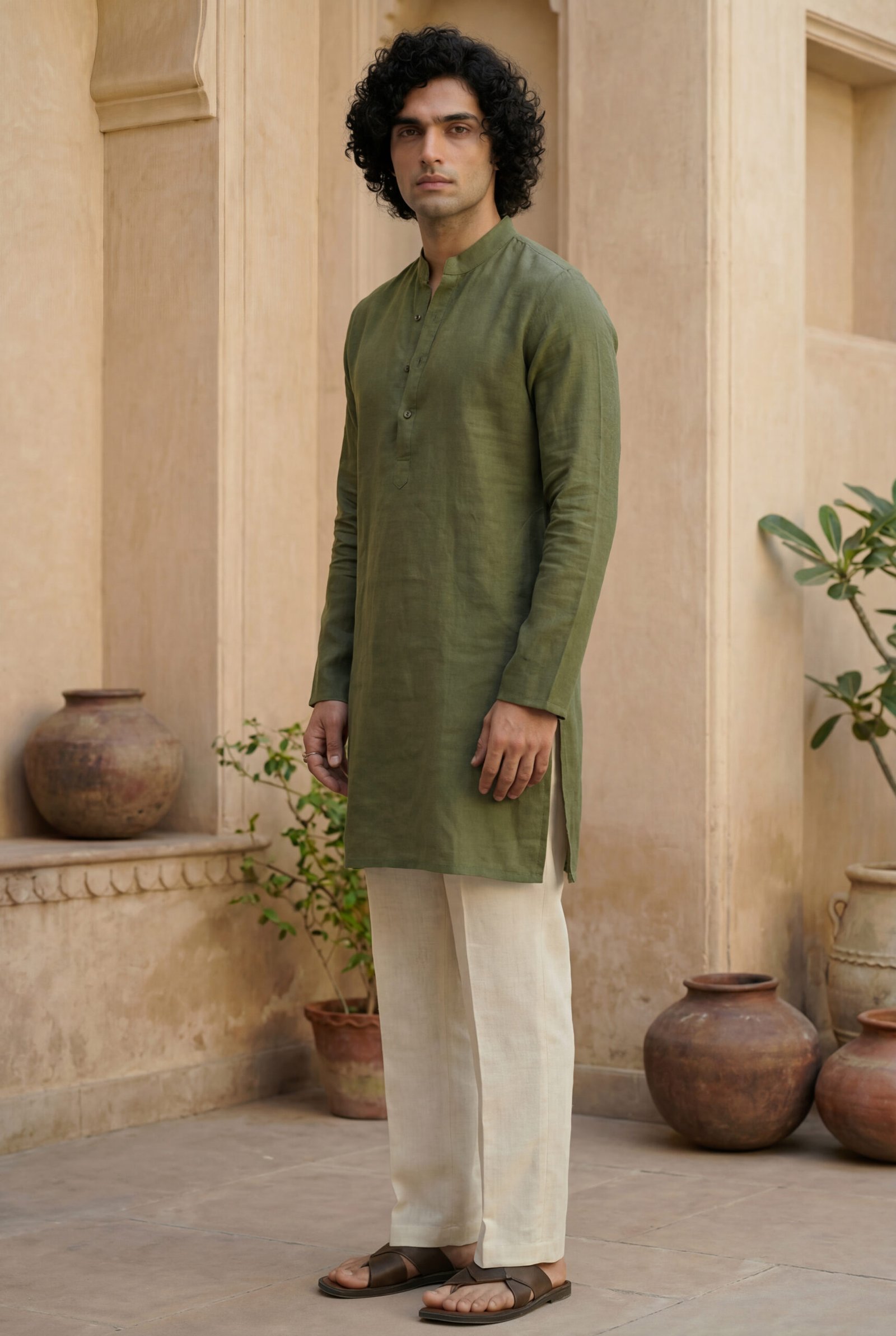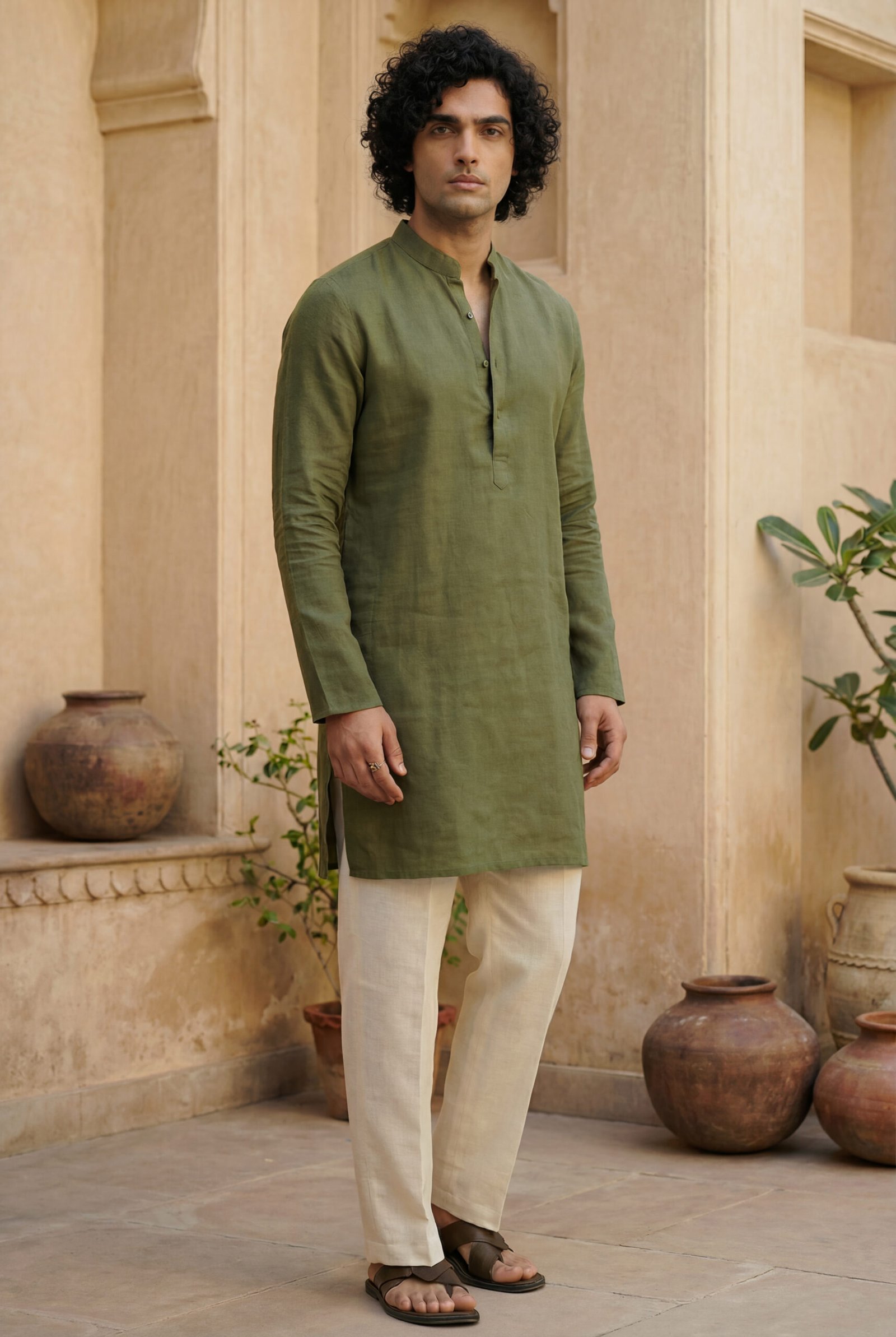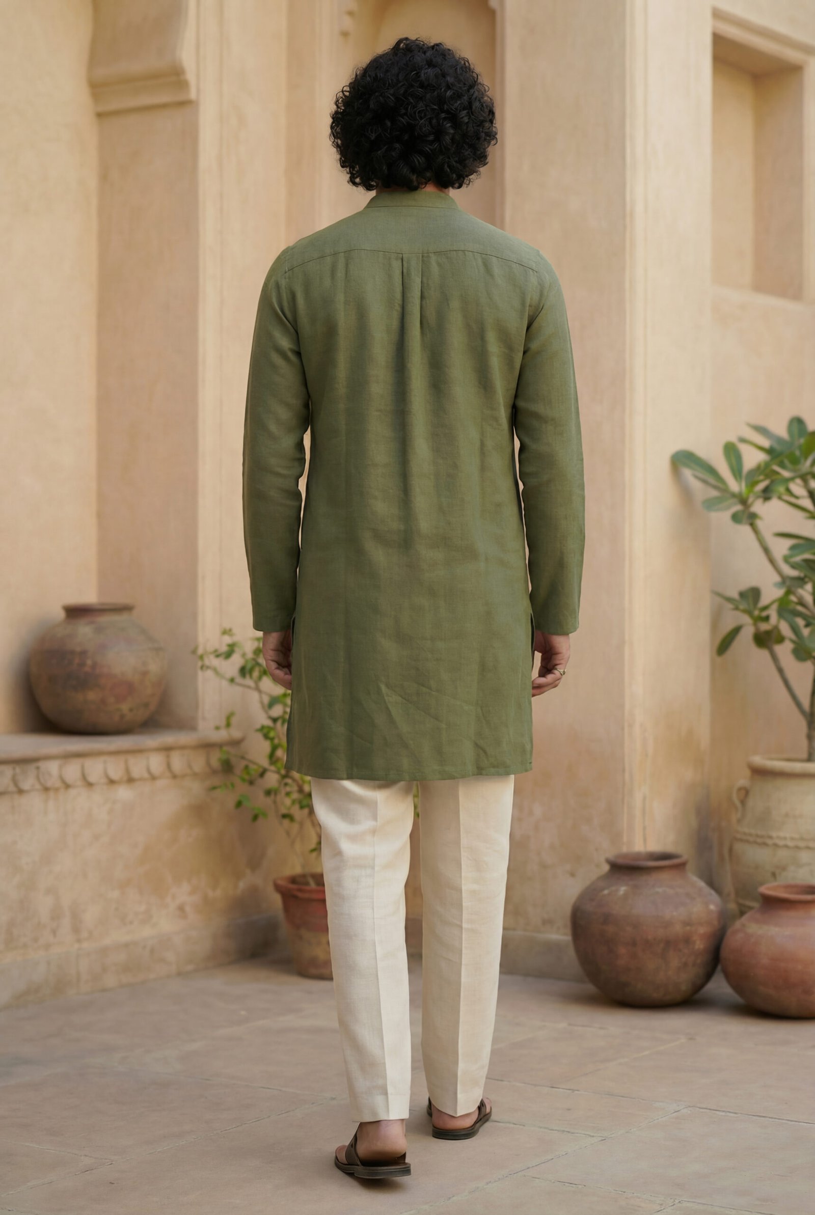 Paired with classic off-white cotton-linen straight pants, the set achieves a balanced, versatile look. Lightweight and airy, the pants complement the kurta’s earthy moss green tone, making the ensemble ideal for festive mornings, cultural gatherings, travel, and refined everyday wear.