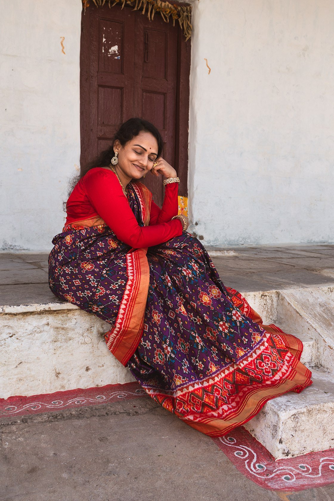 Wrapped in the warmth of tradition, the Gulab Vatika Pochampally Saree blends deep maroons, rustic reds, and intricate floral motifs inspired by village courtyards and old-world charm. Handwoven by master artisans of Pochampally, this saree beautifully marries heritage patterns with vibrant colours, creating a piece that feels both timeless and festive.