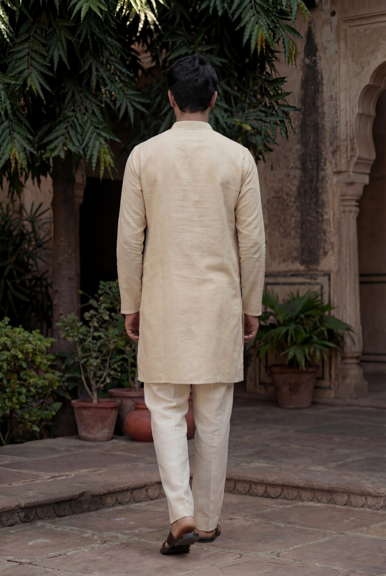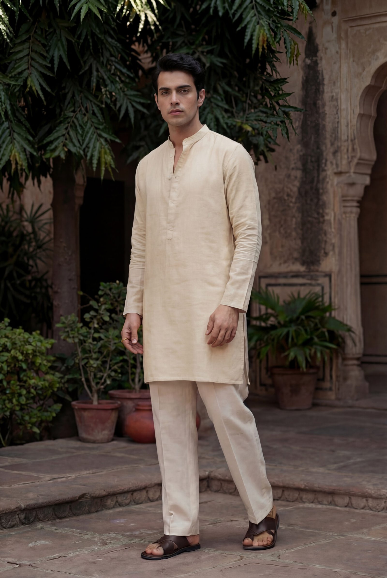 Rendered in a soft sand-beige tone, this set is versatile enough for festive mornings, cultural gatherings, travel, and elevated everyday wear. Designed to be worn together or styled separately, it is a wardrobe essential for men who appreciate understated luxury and natural fabrics.
