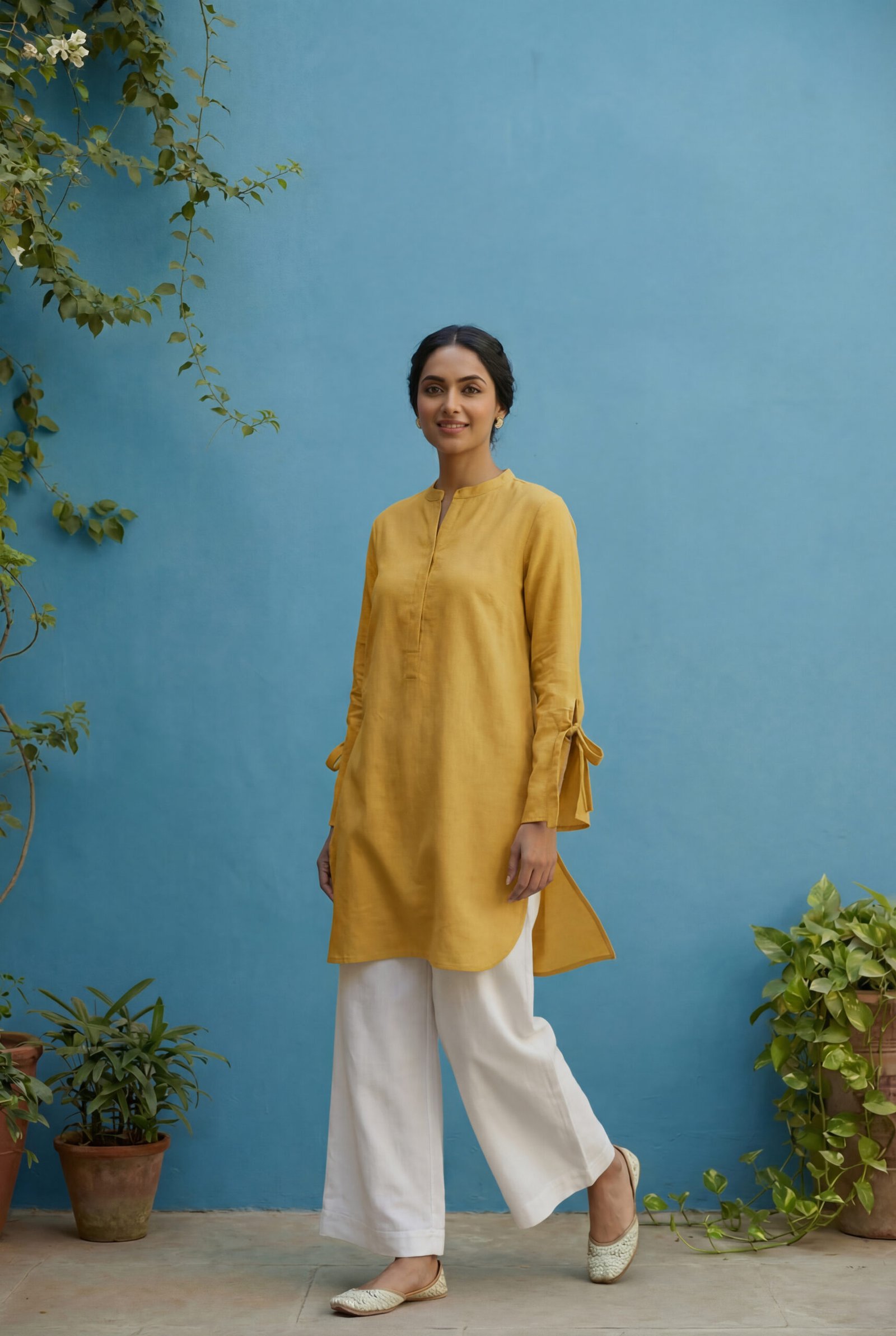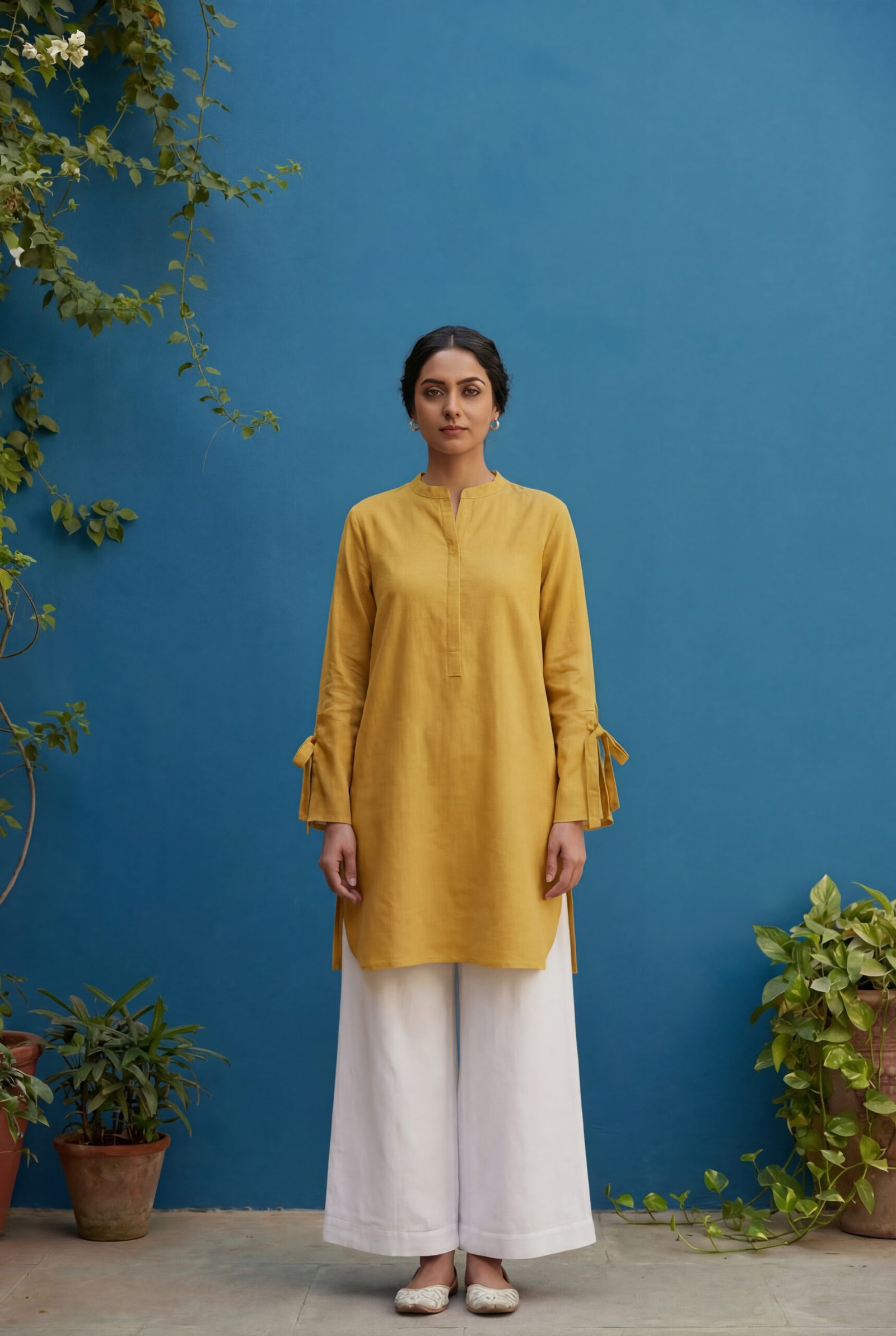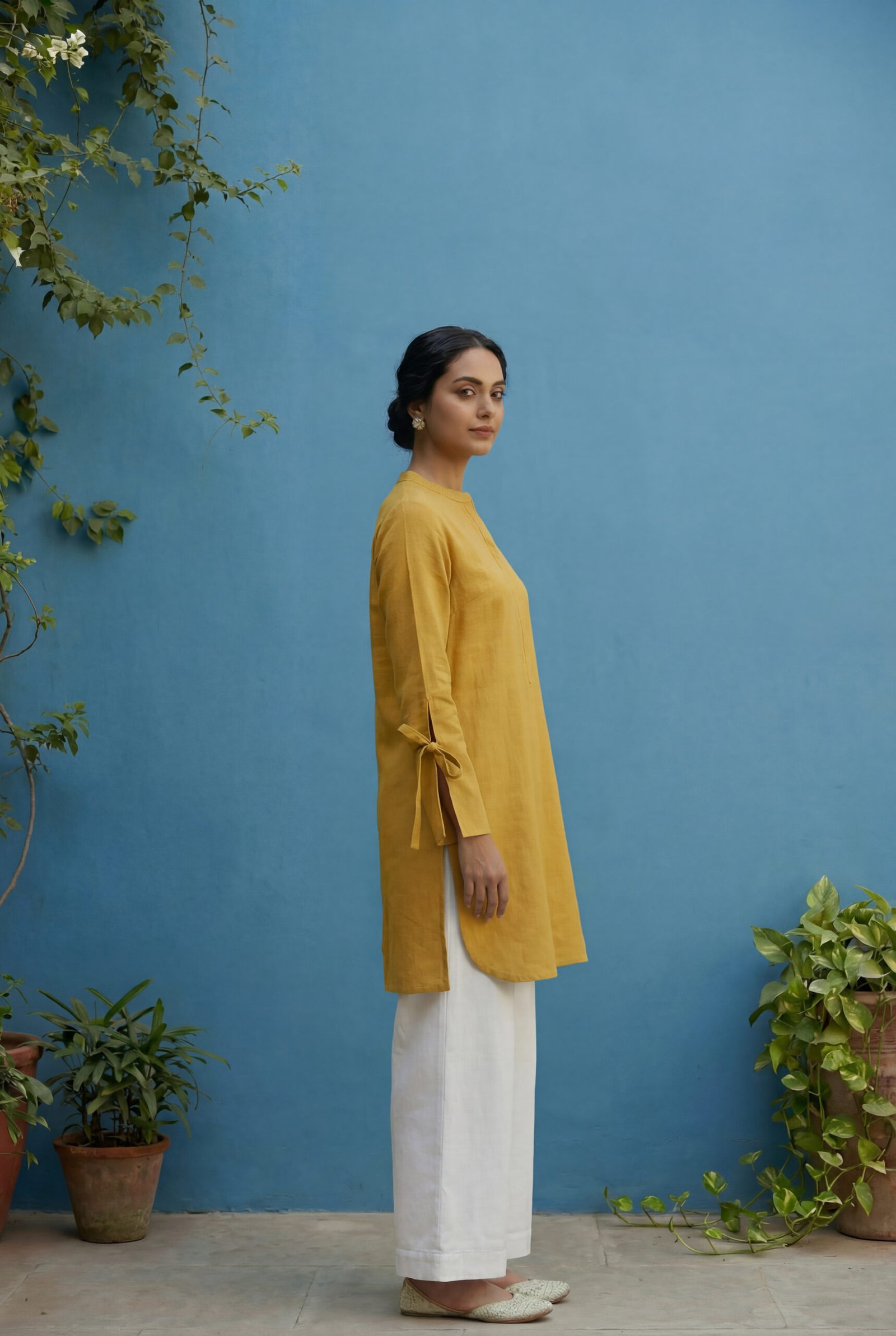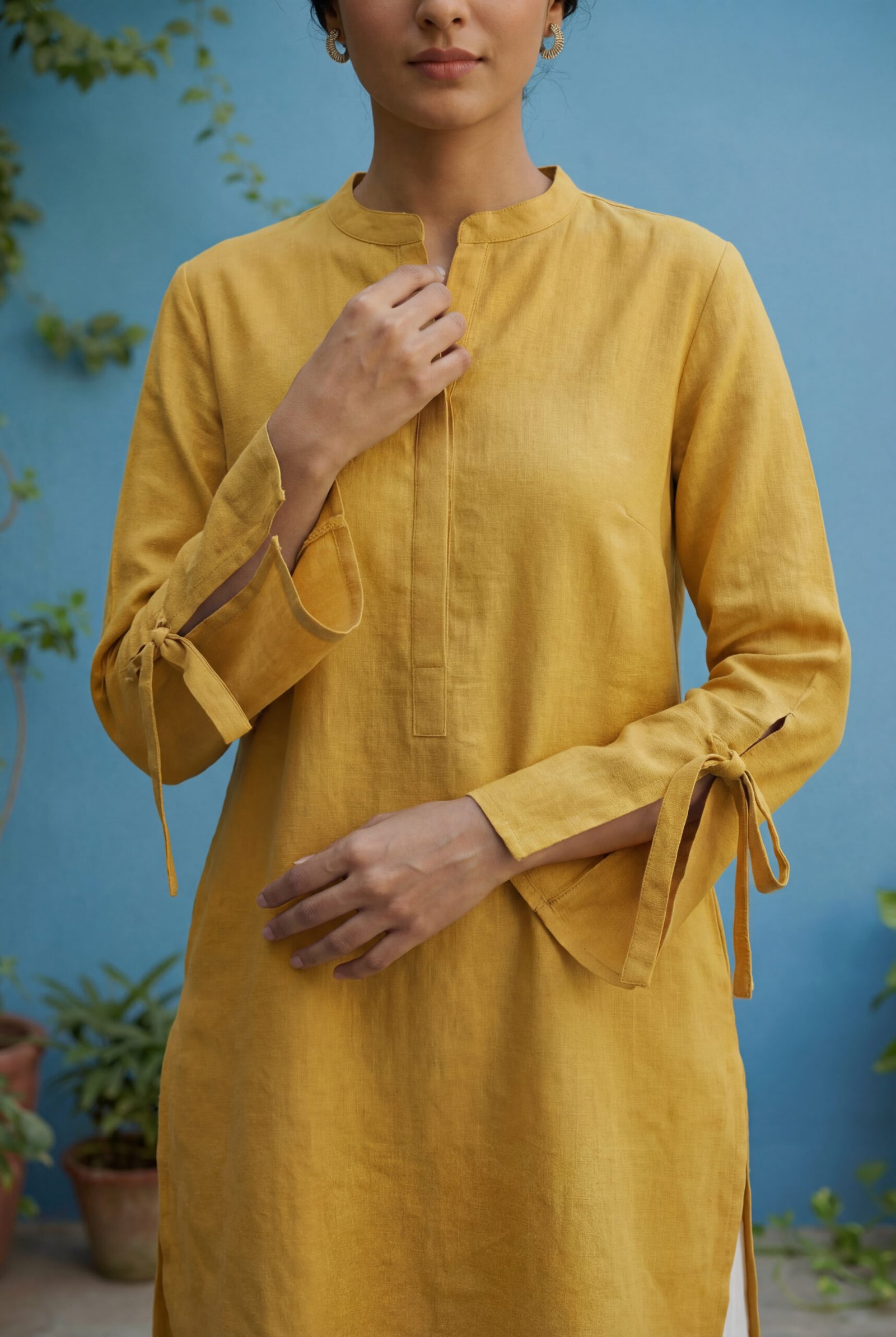 Made from a breathable cotton-linen blend, the kurta offers the perfect balance of softness and structure. The fabric’s natural texture adds depth to the warm mustard tone, while allowing airflow and ease throughout the day. Designed in a relaxed straight silhouette, the kurta features a clean neckline and subtle tie-up detailing on the sleeves, lending quiet character without overwhelming the look.