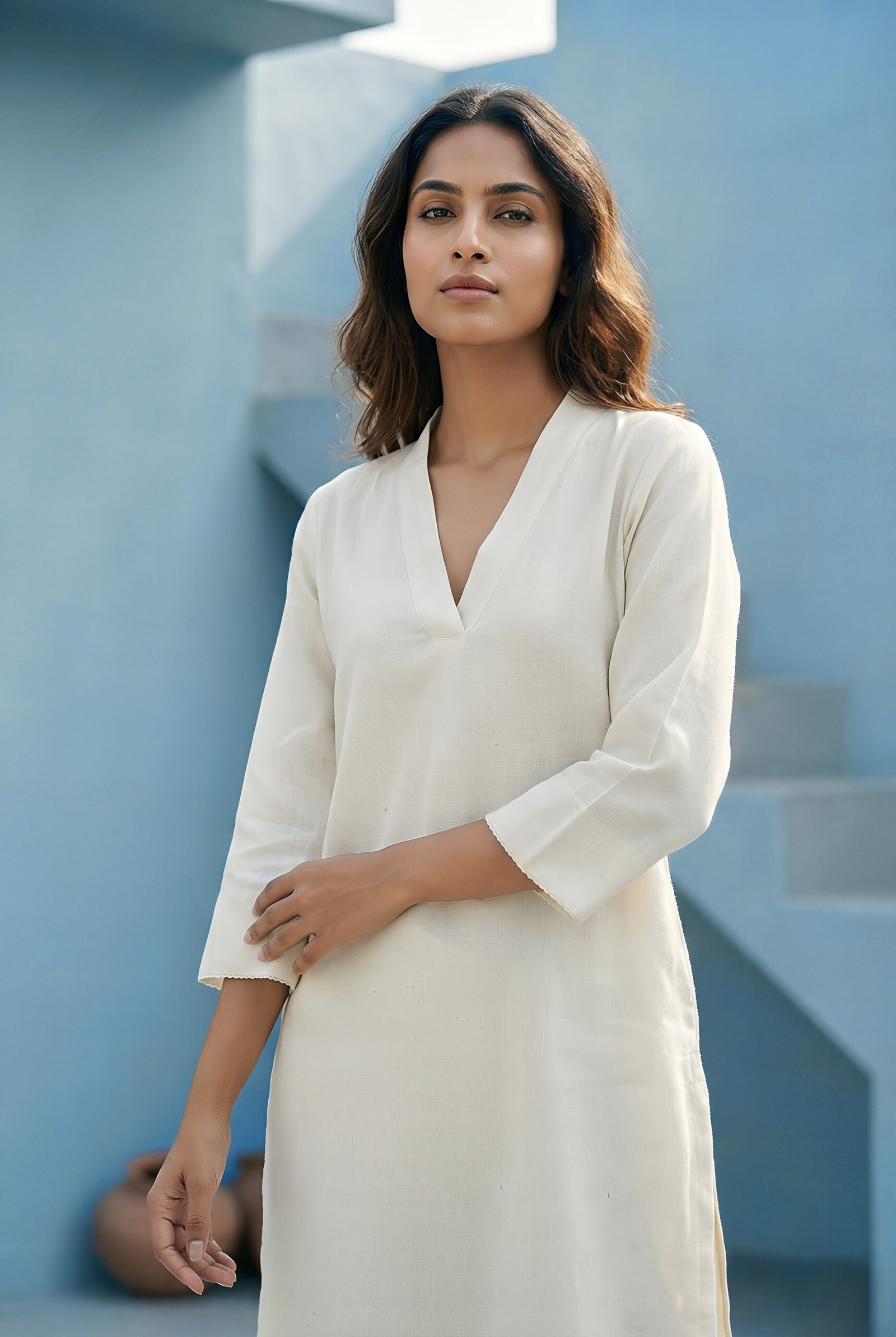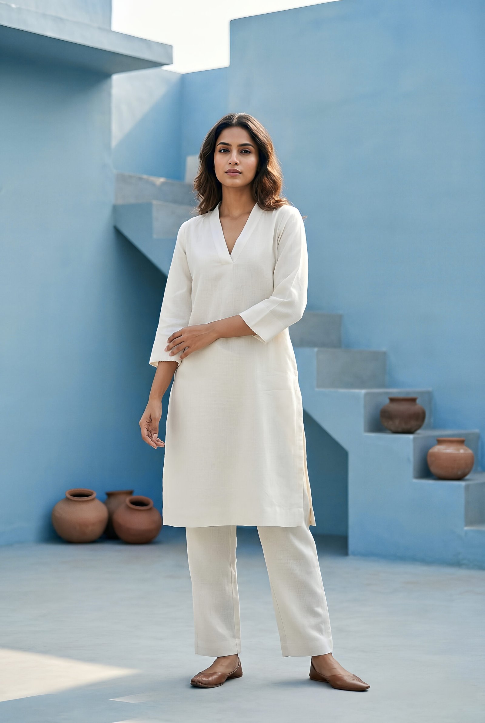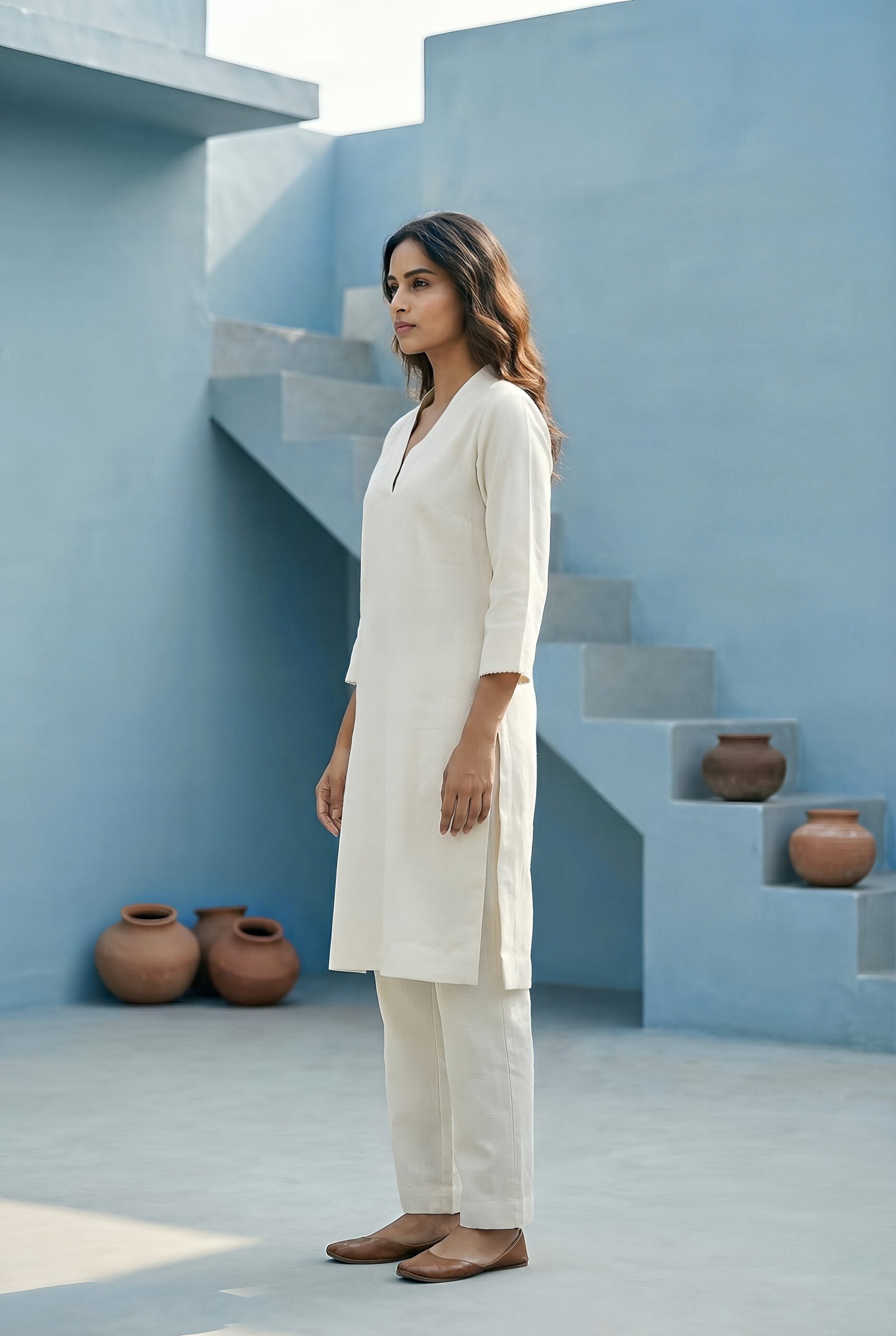 Crafted in a breathable cotton-linen blend, the kurta offers a soft yet structured feel that drapes beautifully on the body. The clean straight silhouette is complemented by a subtle V-split neckline, adding gentle definition while maintaining a timeless, understated look. Full sleeves and side slits enhance ease of movement, making it suitable for long, unhurried days.