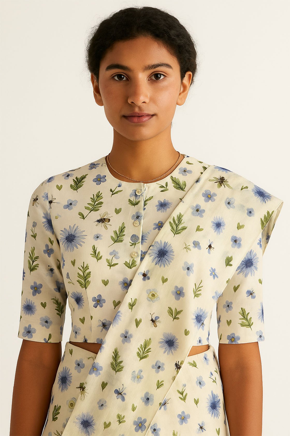 Drape yourself in botanical beauty with our Wildflower Whispers Saree, featuring a serene ivory base adorned with hand-drawn blue wildflowers, green foliage, and subtle touches of nature-inspired motifs. Crafted in soft, breathable fabric, this saree exudes effortless grace and makes for a perfect pick for daytime gatherings, summer festivities, or intimate celebrations. Pair it with minimalist jewelry for a look that speaks elegance in every fold.